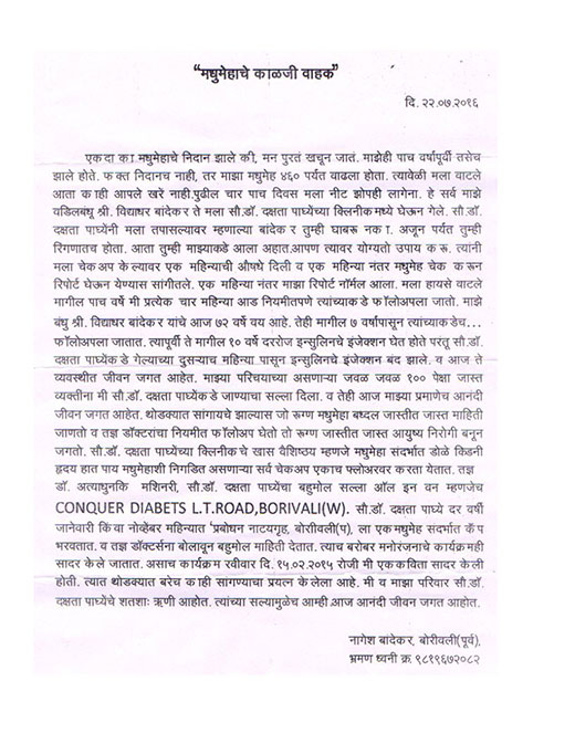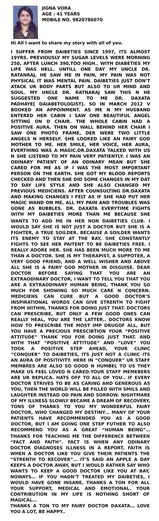 After being detected with Type 1 Diabetes, it was a task to find the right Diabetologist. Many of them would only add on to my family's fear. But on meeting Dr. Dakshata Padhye my family and I personally realised that this is something we need to learn day by day while keeping in touch with her. It has been more than 5 years now that I am with Dr. Dakshata and it’s safe to say that she knows how my sugars act better than myself. Many thanks to her for also getting me on the insulin pump which has helped me control sugars so well. Today we are studying and learning about controlling Diabetes under the guidance Dr. Dakshata Padhye.